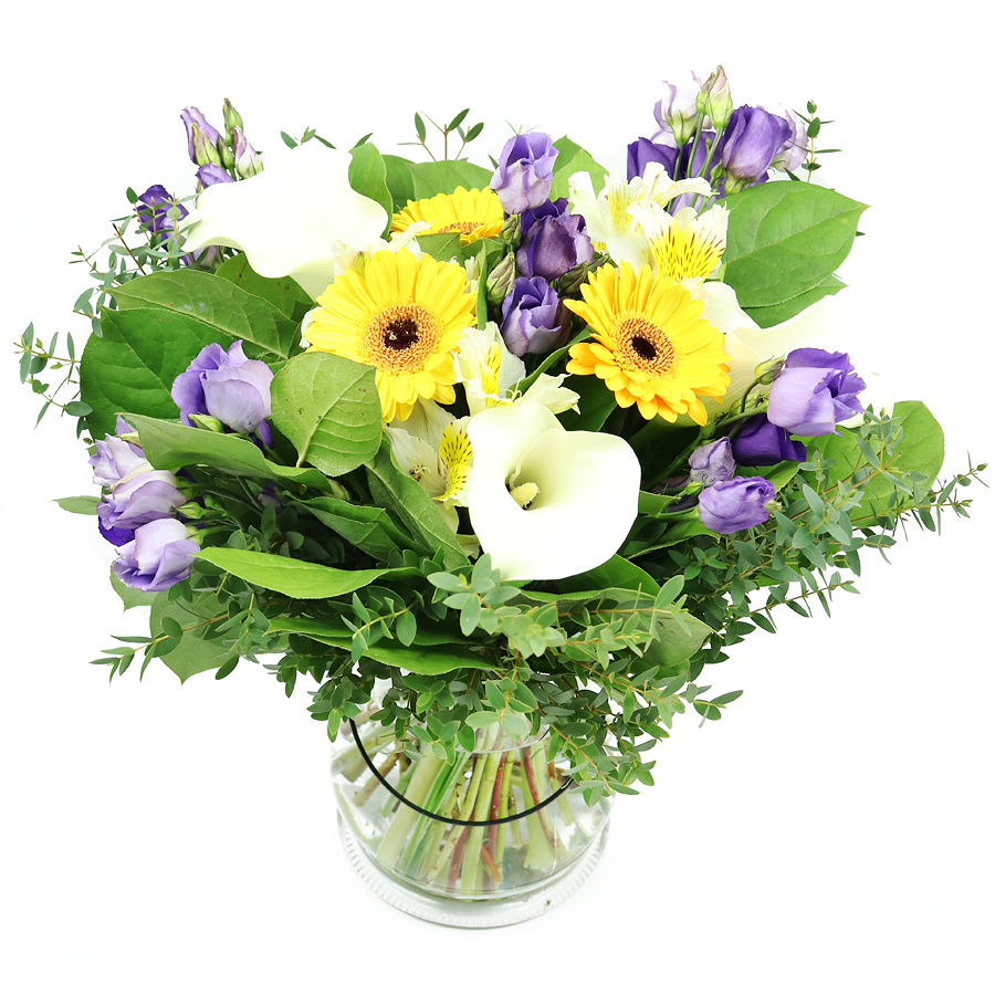 Experience the artful blend of fresh, hand-picked blooms in our Nature's Masterpiece arrangement. Featuring elegant white calla, vivid yellow gerberas, sophisticated purple lisianthus, and lush greenery, this bouquet is designed to impress and inspire. Each flower arrives in its bud stage, allowing you to witness the delightful transformation as they blossom, ensuring beauty that lasts for up to 5 days.