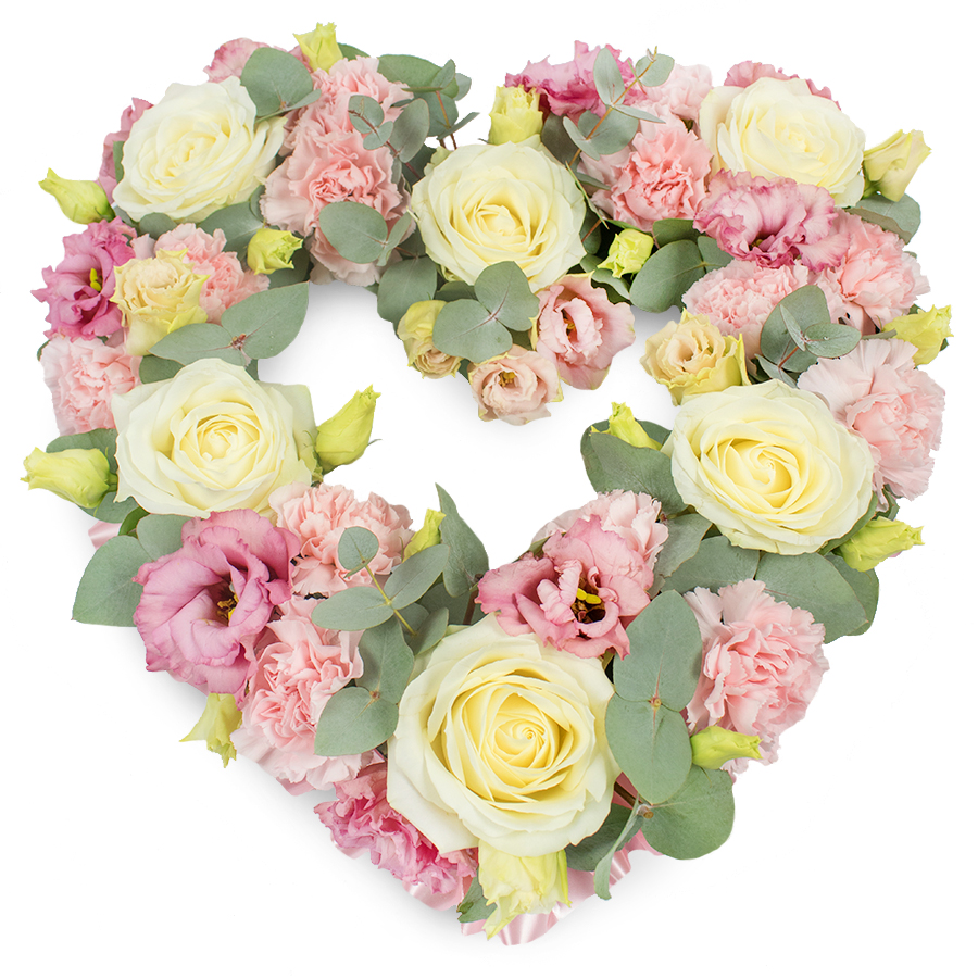 Express your heartfelt sentiments with our elegant open heart floral tribute. This exquisite arrangement combines white roses, pink carnations, pink lisianthus, and eucalyptus leaves, creating a beautiful and meaningful display.